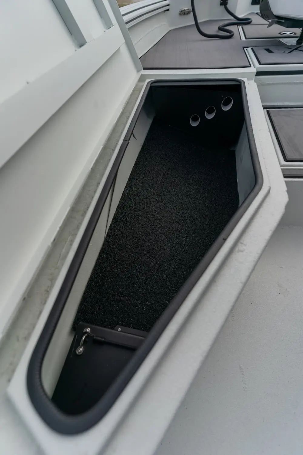 The two front lockable boxes hold up to 12 fishing rods, 6 in each. The boxes are designed with a recessed water lip under the cover that channels water away from the box and on to the floor where it drains into the bilge area. This allows you to put rods and other items in the box where they will be guarded from rain and wave splash.