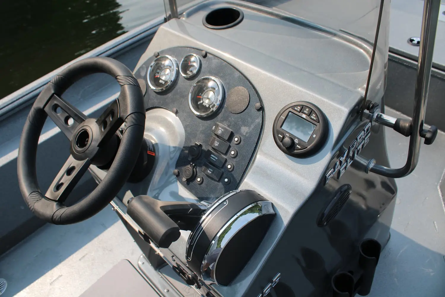 Our bay console has it all. The list is clearly worth mentioning, a removable tinted windshield and stainless grab rail that tip down for low garages, full set of gauges, switches with resetable breakers, 12v plug, mounting space for your fish finder, stainless five-spoke steering wheel w/steering knob and gauge option, optional hydraulic steering, 6 side rod holders and a 16 gallon livewell on the 203 and 220 models, and great storage below with a hinged access door. And, an up front three-tray tackle center built into the console padded seat-back. First class indeed.