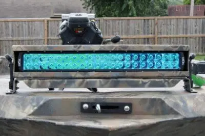These 5800 Lumen twin LED tough headlights will show you the way through open marshes of the midwest or the timber of Arkansas. The lights can be adjusted upwards/downwards as needed, and the base swivels around for backing the boat up or any direction you want to put out your decoys out. Shock absorbing hold downs help protect the light assembly when going through brush and timber.