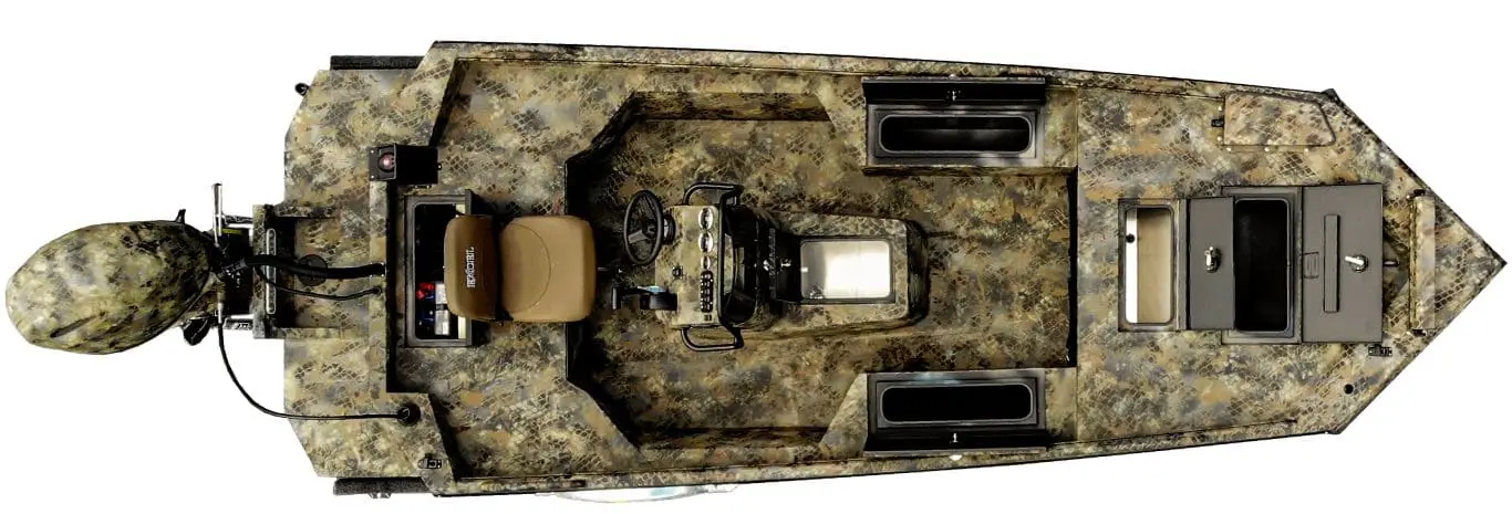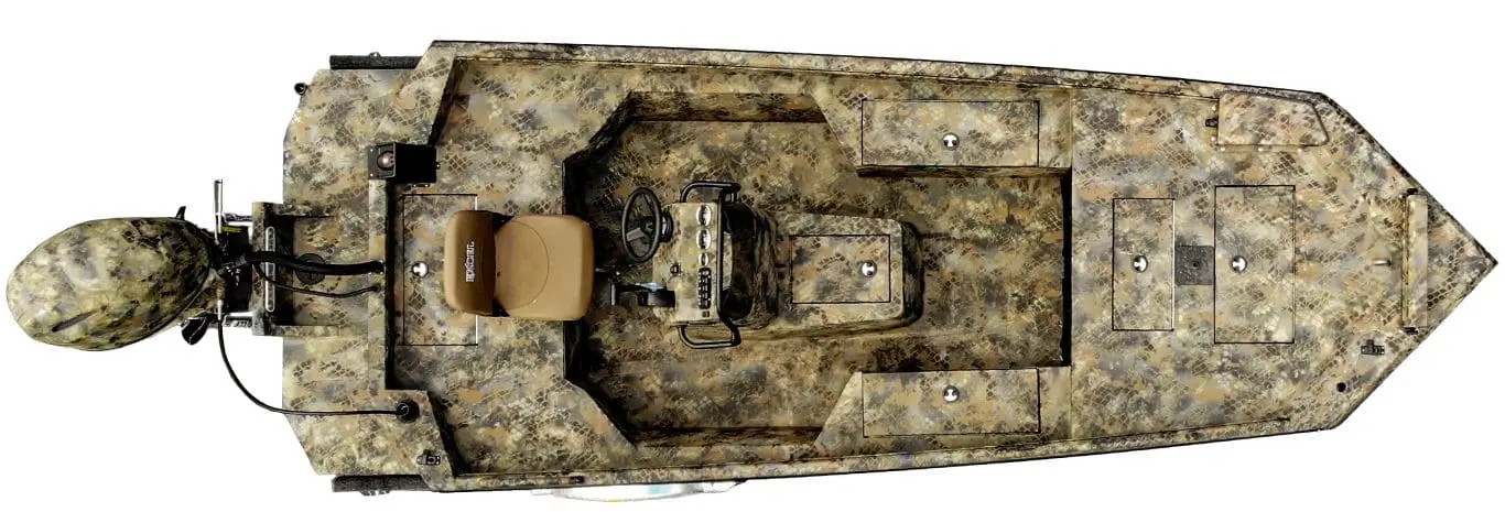 This boat was built with toughness in mind and .125 gauge 5086 grade aluminum hull, and it means business. This rough-n-ready boat is at home in the duck marsh or as your go-to fishing rig. Standard features include a fuel tank, front deck livewell, twin gun boxes, F4-step deck and streamlined aluminum center console. Ideal for the Mud Buddy HDR 5400EFI or any outboard up to 90HP.